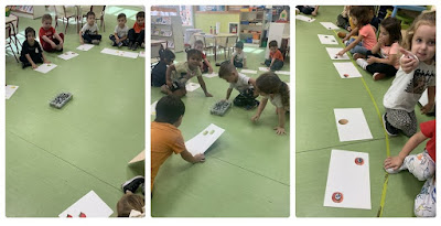En la segunda actividad repartimos las láminas de subitización del 1, 2 y 3 en la asamblea y colocamos en el centro la caja llena de chapas. Por grupos de cuatro o cinco peques han de ir a la caja y coger las chapas correspondientes para colocar una chapa sobre cada objeto que aparece en su lámina. De esta forma trabajamos las equivalencias uno a uno. Algunos las cuentan antes de ir a por las chapas y otros solo van y cogen chapas y según si necesitan más o les sobran vuelven a la caja a coger o dejar chapas. Es muy importante que las chapas, tapone su otros elementos que utilicemos sean todos iguales para que no despisten a los peques del objetivo de la actividad.