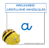 Este panel para el Bee bot lo preparé para los peques cuando estábamos en el nivel de 5 años. Normalmente no comenzamos a presentar de manera general las minúsculas hasta el nivel de 5 años. Preparamos este panel para relacionar la grafía de las vocales en mayúsculas con su correspondiente en minúsculas. Para esta versión para descargar también he preparado cinco casillas con una imagen cuyo nombre contiene una sola de las vocales, es decir una imagen para cada vocal, para aadir posibilidades de uso al panel.