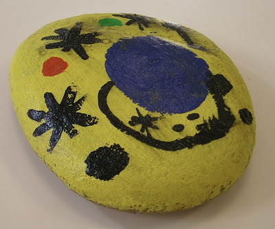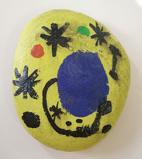 No tenemos fotos del proceso, pero si de la piedra de la seño, que nos sirvió de conejillo de indias. El negro está borroso porque primero lo intentamos con barniz, pero al ver que se corría el rotu negro optamos por la laca. Nos sentimos muy orgullosos de este cuadro y nos lo pasamos fenomenal. Ese día nos dimos cuenta de porque la seño dice que... ¡SOMOS UNOS ARTISTAS!