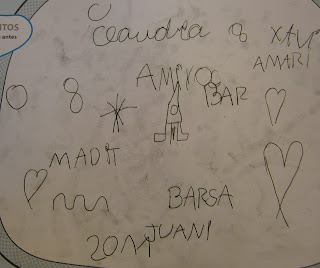 Así que hoy por la mañana después de que la seño nos lo explicara todo, nos ha propuesto escribirles una carta gigante en la pizarra para envíarsela a ellos. Hemos elegido un saludo, hemos contestado a sus preguntas y les hemos hecho otras y finalmente nos hemos despedido. Mientras hacíamos nuestro trabajo de hoy salíamos de uno en uno a escribir un trozo de la carta y este es el resultado.