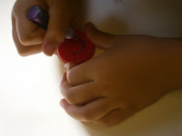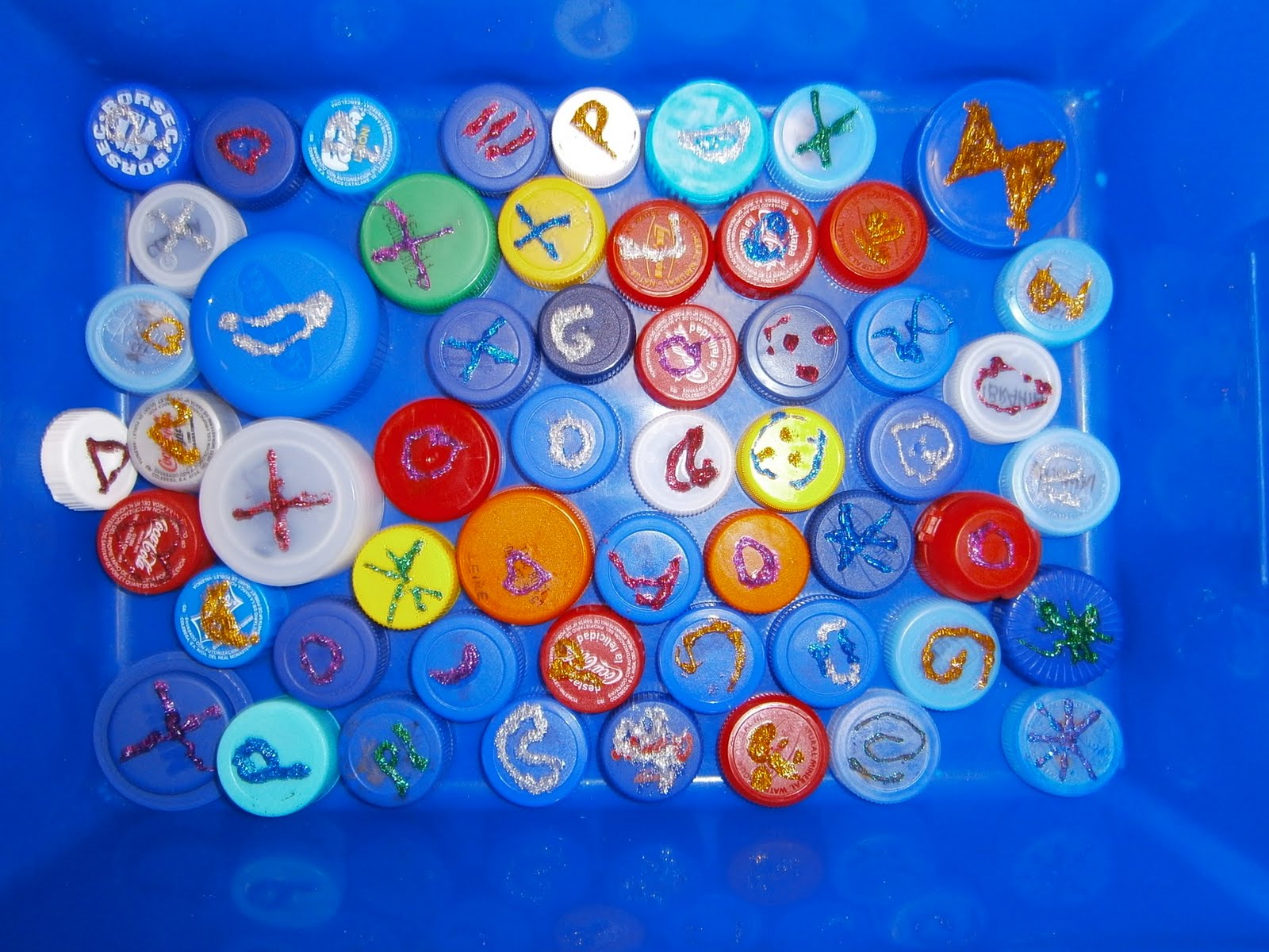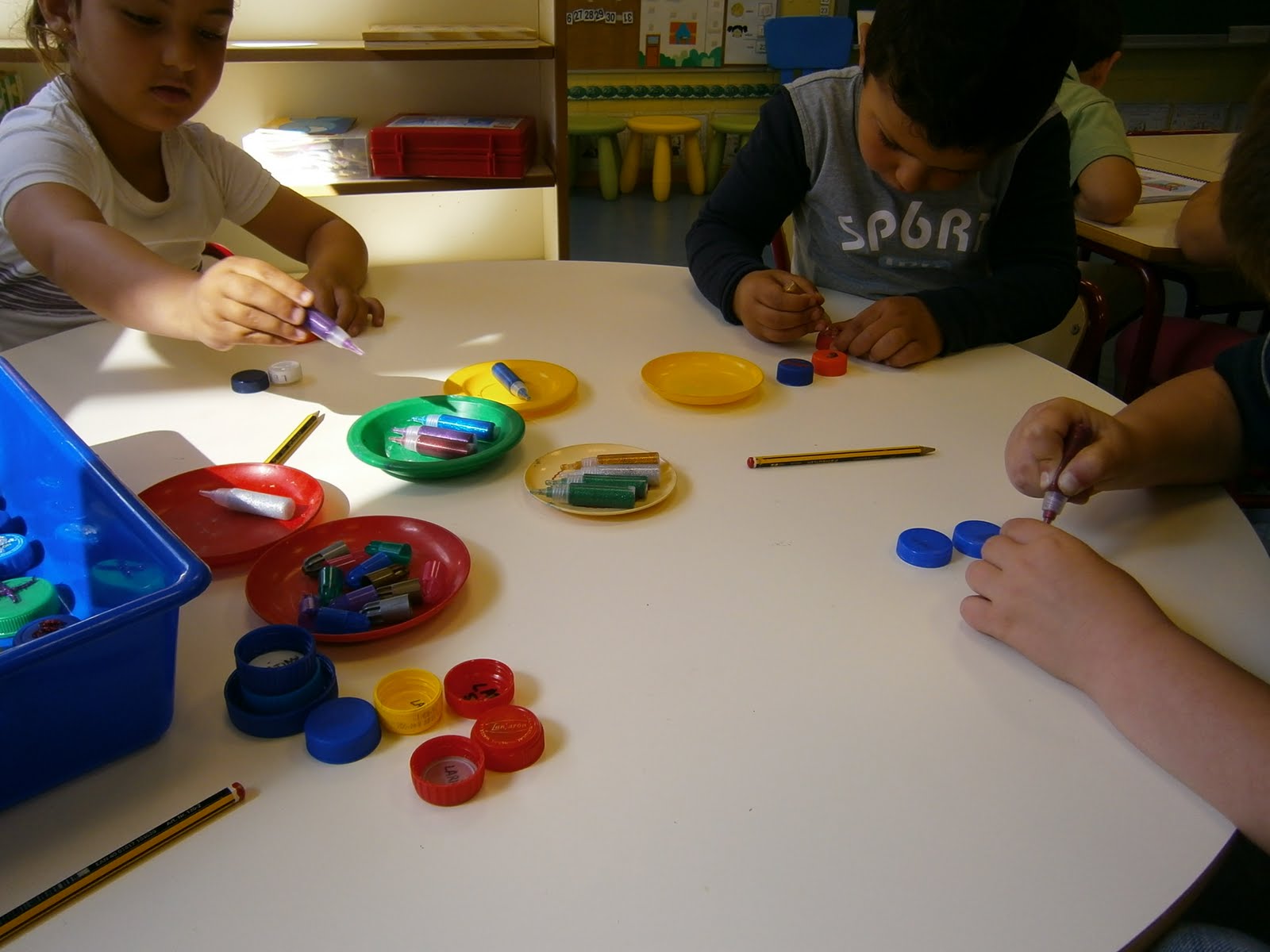 La técnica que queríamos poner en práctica consistía en hacer tampones de estampación con tapones de botella. Para ello trajimos al cole tres tapones de botella cada uno. Con pegamento de purpurina realizamos formas diferentes sobre cada uno de nuestros tapones. Primero lo hizo la seño con sus tapones y comprobamos que se podía estampar untándolo en la almohadilla con tinta. Hasta aquí podéis ver en las fotos que todo salió perfecto: