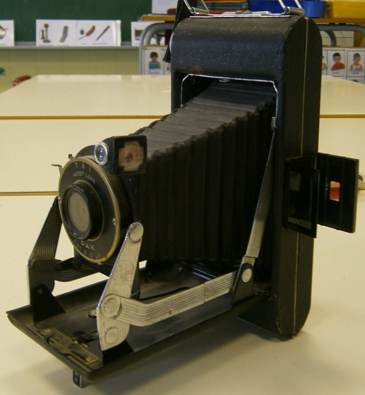 Pero el otro día la seño nos trajo la más vieja de todas. Además nada más verla (abierta claro, porque cerrada no sabíamos ni lo que era) nos dimos cuenta de que era la misma cámara que aparece en la foto de los carteles que tenemos en clase, de la presentación que se puede ver más arriba. Se llama cámara de fuelle y nos gustó mucho a todos. Mirad que bonita es. ¡ESTA SI QUE ES ANTIGUA!