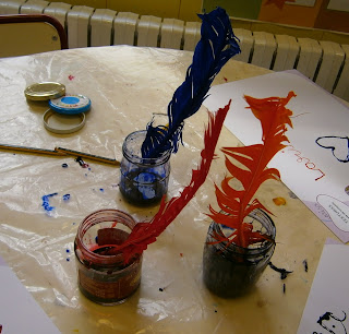 Como hemos visto en la presentación de inventos antiguos y nuevos, antes de existir los bolis, los lápices y demás utensilios de escritura, se escribía con pluma y tinta. Hemos querido experimentar esa forma de escritura. Para ello, aprovechando una de las láminas de plástica, la seño nos ha traído tres plumas de colores (roja, azul y naranja) y tres botes de tinta de color negro, azul y rojo.