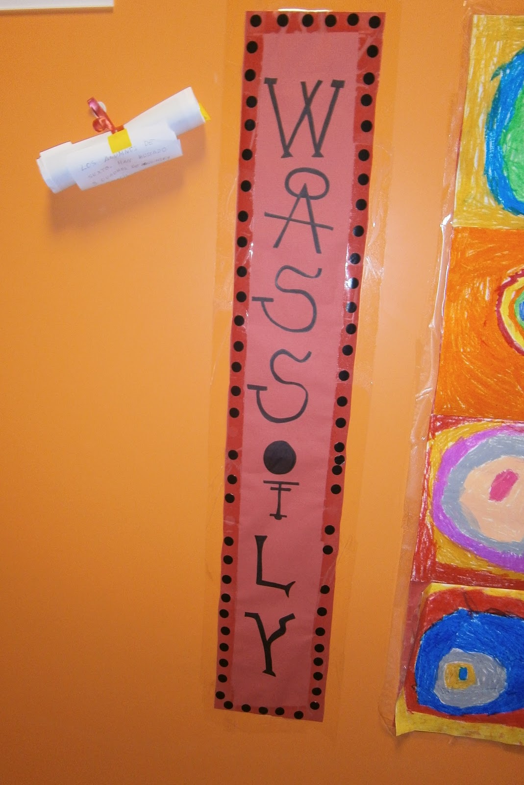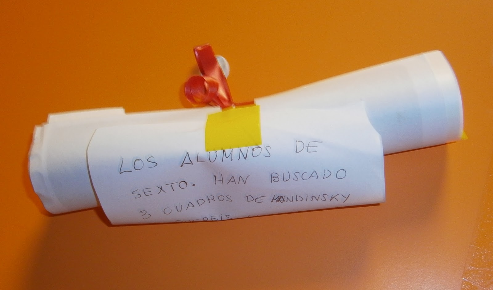 En primer lugar, cada clase de 6º, tenía que escoger un cuadro, para entregarnos tres diferentes y que los enanos de 4 años votaran hasta quedarse con uno solo. Y así fue como lo hicieron, pero nos encontramos con un imprevisto. Como podéis ver en las fotos que hay a continuación, una tarde nos encontramos un rollito de papel que nos habían dejado nuestros compañeros de 6º (evidentemente eran los tres cuadros elegidos).