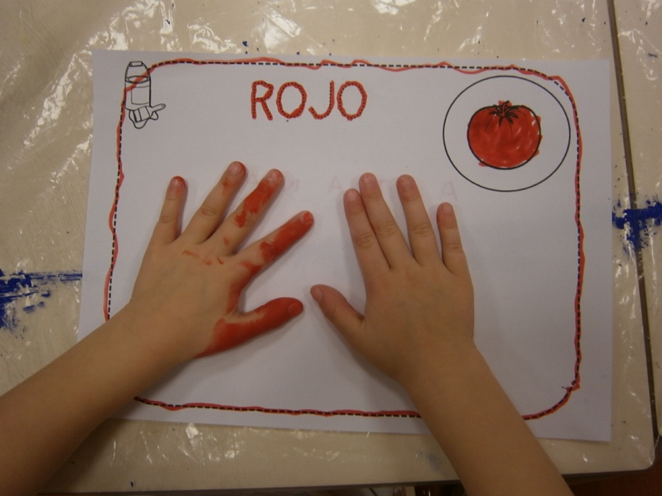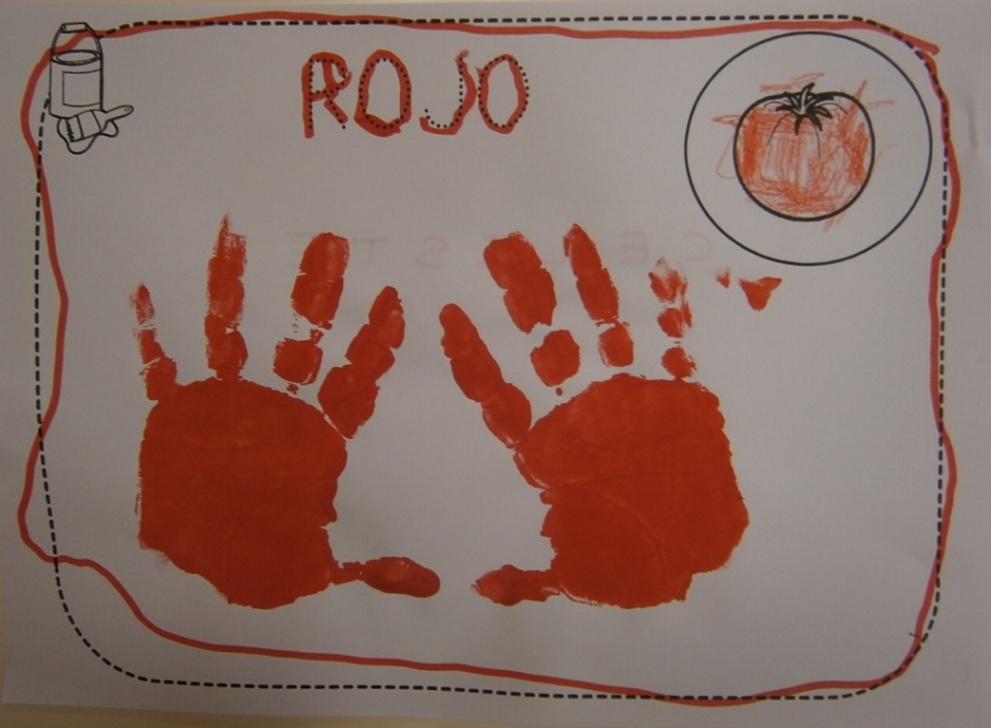 Lo primero que hemos hecho ha sido estampar nuestras manos en una ficha preparada para recordar cada semana los diferentes colores que vayamos trabajando. Repasamos el marco, las letras del color ROJO y pintamos una cosita de ese color, en este caso un tomate. Esto lo haremos todos los días con el color correspondiente de cada taller.