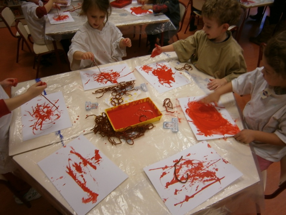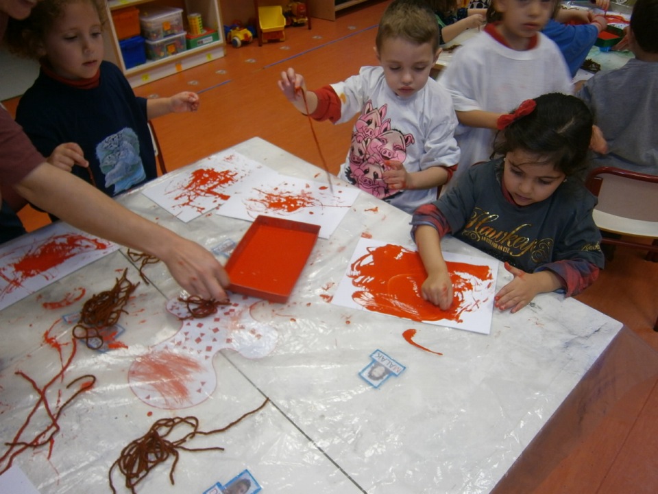 PINTAR CON LANA. Hemos presentado unas bandejas con pintura roja (bastante líquida) y un montón de trozos de lana cortados. De manera totalmente libre han pintado con lana, arrastrando, goteando, haciendo bolas, etc...