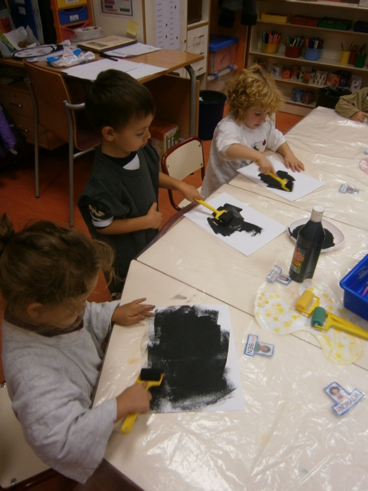 - En cada taller se trabaja un color diferente y una técnica plástica diferente y ese día todos venimos vestidos al cole con la máxima ropa de ese color e incluidos los papás participantes, jeje.