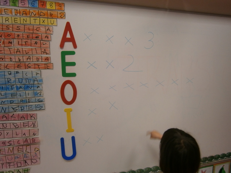 Cada uno escoge la vocal que le apetece y vamos marcándola con una cruz. Posteriormente contamos las cruces que ha obtenido cada vocal y evidentemente la que más tiene es la VOCAL DE LA SEMANA.
