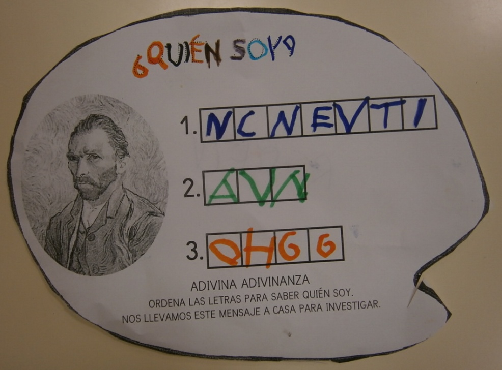 En la última sesión de nuestro proyecto de VAN GOGH recibimos una carta del señor desconocido en la que había muchos códigos QR. Al leerlos nos encontramos un montón de letras y en esta sesión los escribimos en una hoja según nos los encontramos en los tres sobres: las letras del sobre azul de color azul, las letras del sobre naranja de color naranja y las del sobre verde de color verde.