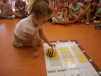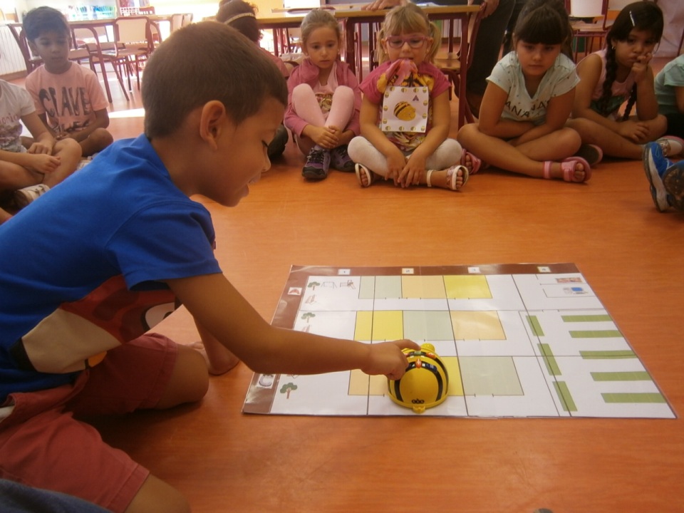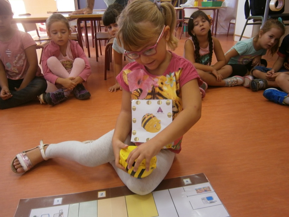 Una vez encontrado el Bee Bot enseguida le dieron la vuelta y la pusieron en marcha. Les enseñé cómo la abeja podía ir desde nuestra clase a cualquier punto del cole, en el plano: cómo ir para adelante, para atrás y cómo girar. Y rápidamente ellos se pusieron a practicar. Pasamos un rato realmente divertido y esto es sólo el comienzo de un montón de experiencias que vamos a vivir con nuestra abeja o Bee Bot a la que ya le han puesto nombre: PINCHITO.