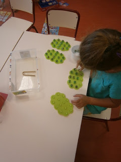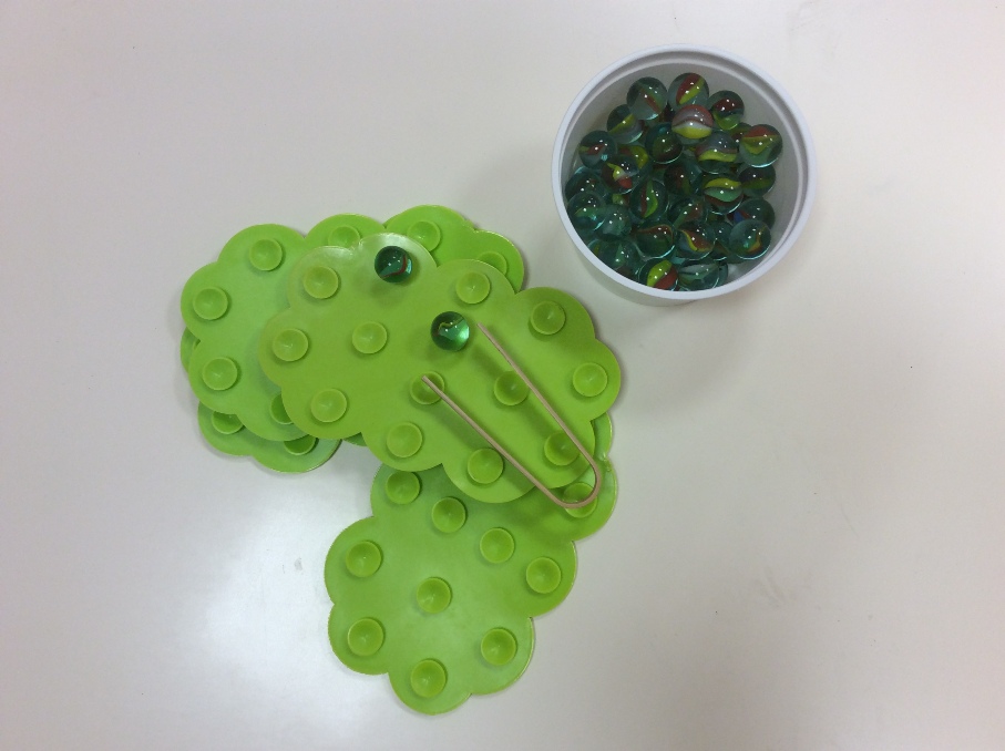 Es muy sencillo de utilizar: con las pinzas hemos de coger de una en una cada canica y colocarla sobre las ventosas delas nubes. Parece muy fácil pero necesitan mucha concentración y precisión. Es un material muy sencillo de conseguir y que les ha gustado mucho. Además les encanta ir contando las canicas que van colocando. Todos los materiales primero los presentamos en gran grupo y posteriormente se quedan en el rincón de lógica-matemática para uso libre.