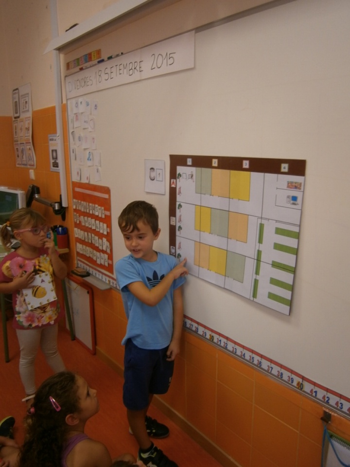 Realmente pensé que les costaría darse cuenta de qué era el plano, pero antes de poder preguntarles nada ellos ya empezaron a decirme que era el plano del cole. El patio con nuestros árboles, bancos y columpios. La sala de informática y biblioteca, el comedor y los tres pasillos de infantil: 1º de infantil, 2º de infantil y 3 de infantil. Esto me hizo mucha gracia porque es un término que yo nunca utilizo, para mi siempre ha sido el pasillo de 3 años, 4 años y 5 años, jejeje. Dentro de cada pasillo hay una clase naranja, otra verde y otra amarilla, así que no tuvieron mucha dificultad en localizar nuestra clase.
