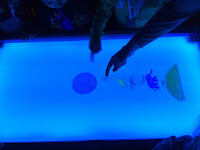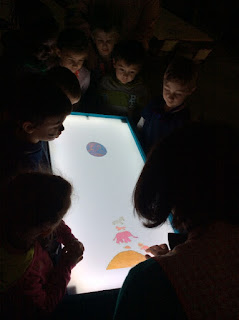 La semana pasada comenzamos a utilizar la mesa de luz para contar cuentos. Aprovechamos horas de desdoble de tal manera que en clase como mucho están 12 alumnos. Así se ponen alrededor de la mesa de luz y como es de gran tamaño (1 x 0'50m) todos pueden ver sin perderse detalle.