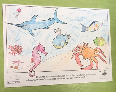 Como ya hemos tenido contacto con otras láminas de Realidad Aumentada rápidamente me dijeron que tenían que pintar los dibujos y verlos con el Ipad y eso es lo que hicimos. Todos pintaron sus dibujos con colores suaves, sin apretar y respetando las líneas negras de los bordes. Ellos ya saben que si pintan "a rayajos" o con colores muy fuertes no se puede "ver la magia".