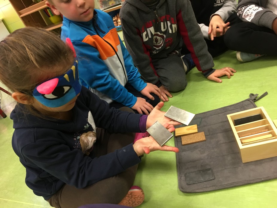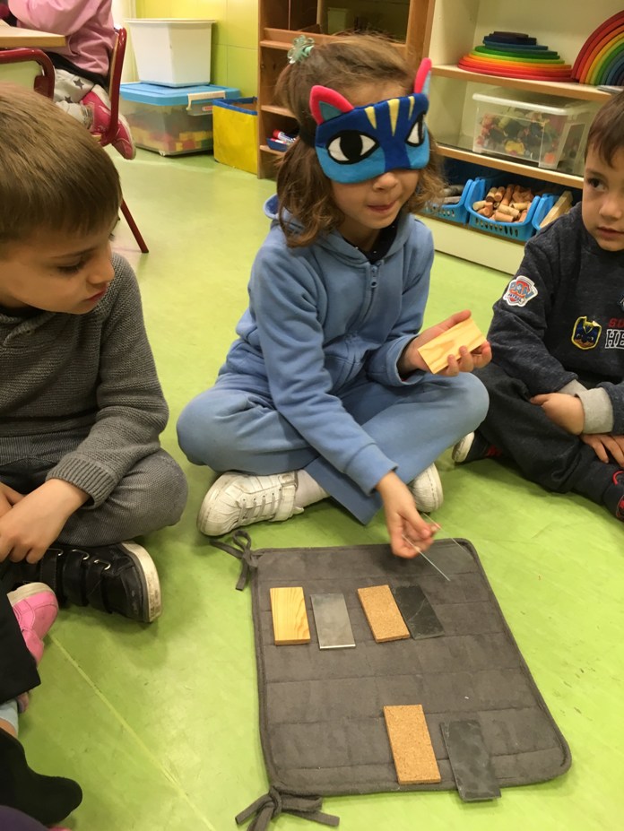 Con los ojos tapados lo tocamos durante un pequeño rato para intentar sentir y adivinar qué material tienen entre sus dedos. A continuación tocando uno a uno los que se encuentran en la alfombrilla intentan encontrar la pareja de esta tabla, es decir la que es del mismo material.