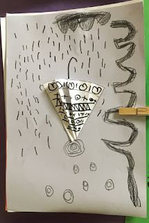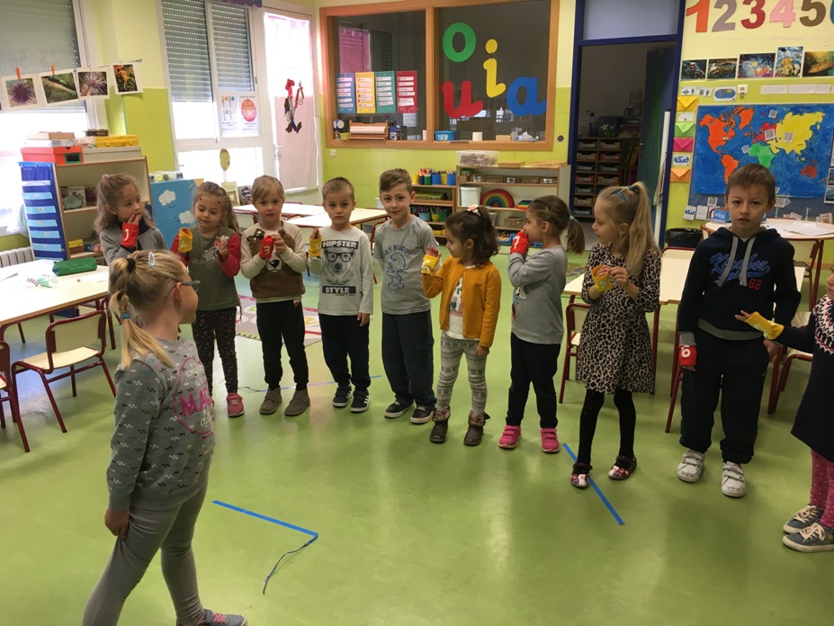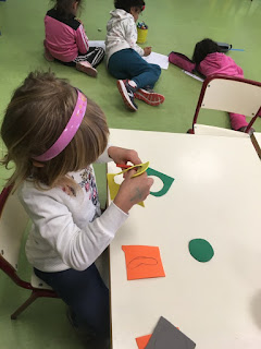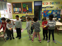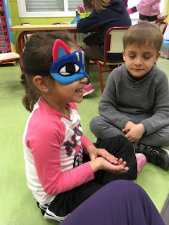 Los peques se organizaron por parejas y uno de los miembros de la pareja se colocó el antifaz, mientras el otro miembro de la pareja desordenó las tablas para variar su orden. Escogió una tabla de la caja y se la colocabó en las manos a su compañero.