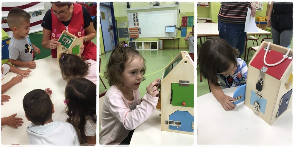 Este es el primer material de vida práctica que pusimos en septiembre y a los peques les encanta: la caja de cerraduras de madera mejorada (Aquí). Como podéis ver en las imágenes es una casa de madera (como bien su nombre indica) que en cada una de sus paredes y en el techo incorpora un tipo de cerradura diferente: un pestillo, un candado, una palanca, una cadena...